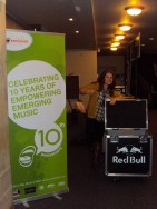 On Thursday, it seemed the Sonicbids crew was all over the place. Our ceo, Panos, was at the Kimmel Center moderating a panel called “How Brands are Using Emerging Music to Reach Consumers” with Ron Faris, Director of Brand Marketing, Virgin Mobile, Jon Landman, Owner, The Syndicate, Jason Miller, SVP of National Ad Sales, Fuse, Evan Krauss, Executive Vice President Advertising, Shazam, and Matt Hirst, National Culture Marketing, Red Bull US. Panos and the panelists spoke to a packed room of artists, students and marketing folks about the potential of brand and band relationships. Just one floor up, College Day was in action! Heidi and Kimberly hung out at our booth handing out free Red Bull and asking college radio programmers to give us their picks for best unknown artists. In the coming weeks, we are going to pick our favorite artist from the list and hook both the band and student programmer up with some serious swag from Red Bull.